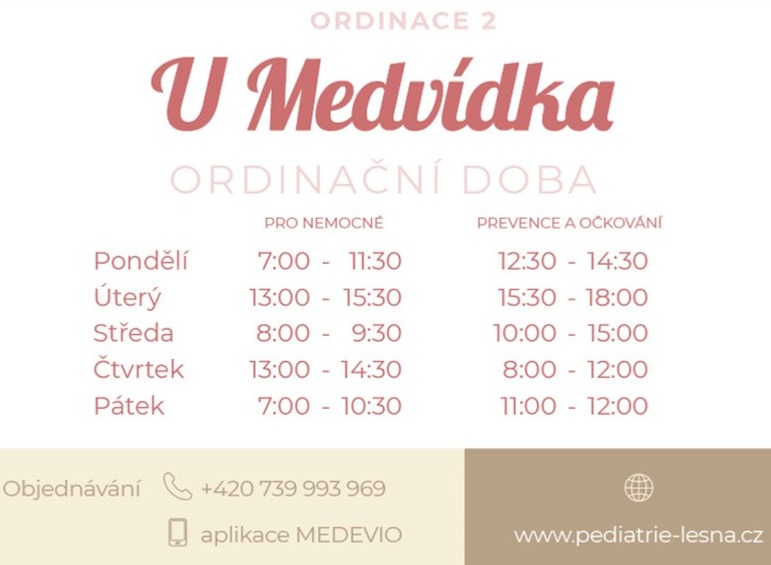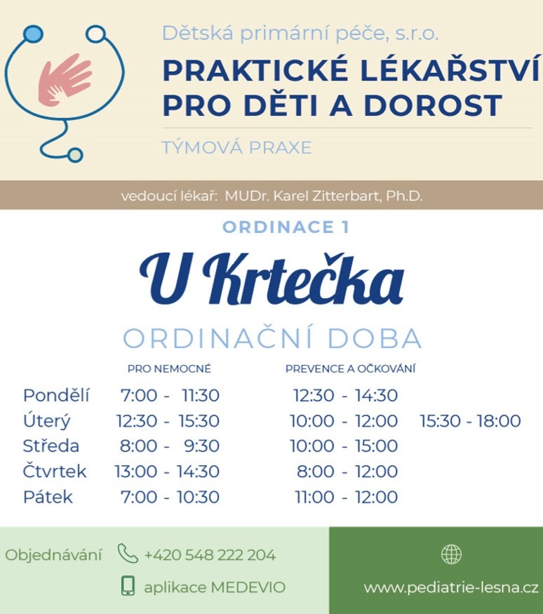 Vážení rodiče, v naší ordinaci, stejně jako v ordinacích ostatních pediatrů na poliklinice (a prakticky v celém Brně), je zaveden objednávkový systém pro akutně nemocné i zdravé. Je nutné se objednat, prosím, před každou návštěvou na telefonním čísle 548222204 (č.1 - U Krtečka), 739993969 (č.2 - U Medvídka). Máme též medevio, elektronickou komunikační platformu. V případě akutní nemoci dítěte prosíme rodiče o zavolání ideálně hned na začátku ordinace pro nemocné. Pomůžete tím co nejlépe zorganizovat péči o všechny nemocné, včetně Vašeho dítěte. Nepřehlédněte také, prosím, rozdělení ordinačních hodin na dobu vyhrazenou pro nemocné děti a pro děti zvané (preventivní prohlídky, očkování aj.). Děkujeme!